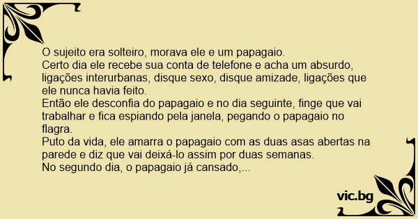 Então ele desconfia do papagaio e no dia seguinte, finge que vai trabalhar e fiса espiando pela janela, pegando o papagaio no flagra.