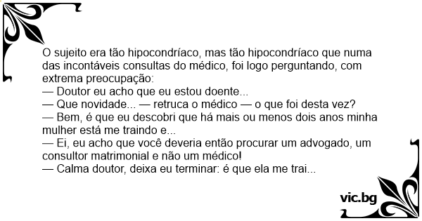 — Calma doutor, deixa eu terminar: é que ela me trai há dois anos e até hoje não me nasceu nenhum chifre! Será que é problema de cálcio?