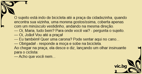 O sujeito está indo de bicicleta até a praça da cidadezinha, quando encontra sua vizinha, uma morena gostosíssima, coberta apenas com um minúsculo vestidinho, andando na mesma direção.