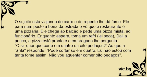 4 или 6? Blonde & Pizza Die Blondine und die Pizza Ποιος θα τα φάει; Аз пицата си я режа на четири парчета… Блондинка влиза в пицария и си поръчва пица. Една блондинка си поръчала пица по телефона. A loira liga para a pizzaria e pede uma pizza. — A senhora quer que eu corte a pizza em quatro ou em oito pedaços? A loira pensa um pouco e responde: — Por favor, corte em quatro. Eu jamais aguentaria comer oito pedaços de pizza. Ruft ne Blondine beim Pizzaservice an. "Eine Pizza Margherita bitte!", sagt die Blondine. "Gerne, soll ich sie in 6 oder in 8 Stücke teilen?" "6, bitte, 8 schaff ich nicht!" Esto es una rubia que entra en una pizzería y el encargado le pregunta: -¿Desea que le corte su pizza en 4 o en 8? - Solo en cuatro, no creo que me vaya a comer 8 pedazos… Przychodzi blondynka do baru i zamawia pizzę. Kelner pyta: - W 6 czy 12 kawałkach? - W 6, bo 12 nie dam rady zjeść. Pizzabagaren: - Ska jag skära pizzan i sex eller tolv bitar? - Ole: - Sex, tack. Tolv orkar jag aldrig. Une blonde commande une pizza : - Bonjour je voudrais une 4 fromages s'il vous plait - On vous la découpe en 6 parts ou 12 ? - En 6, je ne pourrais pas en manger 12 Se encontraban Nito y Neto en su viña y le dice Nito a Neto: Neto, ahora que tenemos teléfono sin bejuco (celular) deberíamos ordenar una pizza de esas que llevan a la casa. Tienes razón Nito,... Vad svarar blondinen, som beställt pizza på pizza hut, när dom frågar om hon vill ha den skuren i 6 eller 12 bitar? 6 tack, jag skulle aldrig orka 12 Una rubia encarga una pizza y el pizzero le pregunta si la corta en seis o en ocho porciones. La rubia responde: - Córtela en seis, sería incapaz de comerme ocho porciones. Een blondje heeft een pizza besteld als ineens de ober vraagt of hij de pizza in 6 stukken of in 12 stukken moet snijden. Waarop het blondje antwoordt: “Nou, doe maar in 6 stukken want 12 stukken... El pizzero le pregunta al cliente: - ¿Le corto su pizza en 4 u 8 pedazos? Y el cliente le contesta: - En 4 nomás, no creo que me coma 8 pedazos. En blondine kommer ind på et pizzaria. pizzamanden: hvilken pizza vil du bestille? blondinen: en skinke pizza pizzamanden: vil du have pizzaen skåret ud i 4,6 eller 8 stykker? blondinen: kun 4 jeg... Een dom blondje gaat naar de pizzeria en bestelt een pizza Margerita Zegt de pizzaman na een tijdje wil je de pizza in 6 of in 10 stukken gesneden?? Zegt het domme blondje; in 6 stukken, want 10... Blondynka zamówiła pizzę. Sprzedawca pyta się, czy pokroić na sześć czy na dwanaście kawałów. Ona opowiada: - Sześć, bo dwunastu to ja nie zjem. Заходить блондинка в кафе і замовляє піцу. Офіціант запитує: — Вам піцу порізати на 6 шматків чи 12? Блондинка: — Ні, 12 я не з'їм. Er komt een domkop bij de pizzeria. Hij bestelt een pizza. Wanneer de pizza klaar is, vraagt de verkoper of hij de pizza in zes of acht stukken moet snijden. De domkop zegt: ‘Doe maar in zes... Blondýnka si objednala pizzu. Číšník se ptá: „Chcete ji rozřezat na šest, nebo na dvanáct kousků?” „Na šest,” odpoví rychle zákaznice. „Dvanáct bych jich nikdy nesnědla!” Um economista (de alguma universidade) andava devagar e foi a uma pizzaria. O balconista perguntou se queria que cortasse a pizza em oito ou em seis pedaços. “Estou com bastante fome. Seria melhor... O blonda intra intr-o pizzerie,chelnerul o intreaba: 'In cate felii sa va tai pizza,sase sau doisprezece?' Re:In sase, te rog, raspunse blonda,doisprezece sunt prea multe pt. Mine. Blondi oli pizzaa ostamassa. Myyjä kysyi: - Leikataanko kuuteen vai kahteentoista palaan? Blondi vastasi: - Kuuteen, en jaksa syödä 12 palaa Sarışın biri bi pizza ısmarlar. Pizacı sorar: 6 parçayamı böleyim, 8 parçaya mı ? Sarışın: 6 parçaya böl , 8 parçayı bitiremem. Bellan var på en pizzeria och skulle köpa en hel pizza. - Vill du ha 4 eller 8 bitar? Frågar killen på pizzerian. Bellman svarar: - 4, jag orkar nog inte 8... ¿ En cuántos trozos te corto la pizza? ¿En cuatro o en seis? En cuatro que yo seis no soy capaz de comerme. A blonde calls a pizza place to have one ordered to her house. They ask her if she wants the pizza cut into 6 or 12 pieces and she says, "Cut it into 6, I could never eat 12 pieces." Bemegy egy rendőr a pizzériába, és elvitelre kér egy pizzát. - Négyfelé, vagy nyolcfelé vágjam? - kérdi a pizzás. - Azt hiszem, elég lesz négyre, nyolcat már biztos nem tudnék megenni... Ateina blondinė į piceriją. Prie jos prieina padavėjas ir klausia: - Panele, jums picą supjaustyti į du ar į keturis galaliukus? - Tai aišku, kad į du ... Keturių aš tikrai nesuvalgysiu ... Une blonde appelle la pizzeria pour passer une commande : L'employé : "En combien de morceaux la pizza? 6? 12? La blonde : "En 6 voyons ! Je ne pourrais jamais manger 12 morceaux toute seule! Uma loira com muita fome, teve a idéia de pedir uma pizza via telefone. Ao atender e perguntar qual e quantos pedaços (4 ou 8) de pizza, a loira respondeu: — Por favor, me mande uma pizza com... O blonda se duce la o pizzerie. Vine ospatarul si comanda o pizza. Cand vine cu Pizza , ospatarul o intreaba : - Domnisoara in cate bucati vreti Sa fie taiata pizza, in 6 sau 12? - In 6, nu pot sa...