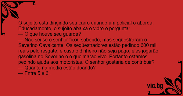 — Não sei se o senhor ficou sabendo, mas seqüestraram o Severino Cavalcante. Os seqüestradores estão pedindo 600 mil reais pelo resgate, e caso o dinheiro não seja pago, eles jogarão gasolina no Severino e o queimarão vivo. Portanto estamos pedindo ajuda aos motoristas. O senhor gostaria de contribuir?