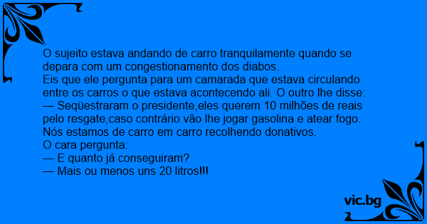 — Seqüestraram o presidente,eles querem 10 milhões de reais pelo resgate,caso contrário vão lhe jogar gasolina e atear fogo. Nós estamos de carro em carro recolhendo donativos.
