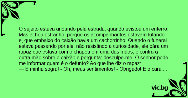 O sujeito estava andando pela estrada, quando avistou um enterro. Mas achou estranho, porque os acompanhantes estavam lutando e, que embaixo do caixão havia um cachorrinho! Quando o funeral estava passando por ele, não resistindo a curiosidade, ele pàra um rapaz que estava com o chapéu em uma das mãos, e contra a outra mão sobre o caixão e pergunta: desculpe-me. O senhor pode me informar quem é o defunto? Ao que lhe diz o rapaz: