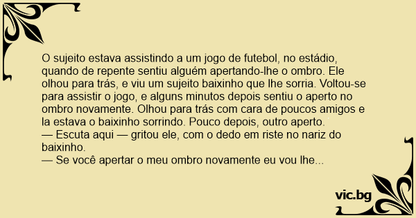 O sujeito estava assistindo a um jogo de futebol, no estádio, quando de repente sentiu alguém apertando-lhe o ombro. Ele olhou para trás, e viu um sujeito baixinho que lhe sorria. Voltou-se para assistir o jogo, e alguns minutos depois sentiu o aperto no ombro novamente. Olhou para trás com cara de poucos amigos e la estava o baixinho sorrindo. Pouco depois, outro aperto.