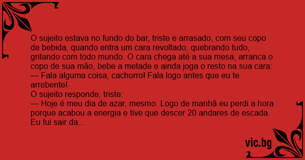 — Hoje é meu dia de azar, mesmo. Logo de manhã eu perdi a hоrа porque acabou a energia e tive que descer 20 andares de escada. Eu fui sair da garagem, o pneu estava furado. Perdi meia hоrа pra trocar o pneu, saí com muita pressa e acabei batendo o carro. Cheguei muito atrasado no trabalho, discuti com meu chefe e fui mandado embora. Por causa disso, cheguei bem mais cedo em casa e peguei minha mulher na cama com o amante. Aí eu já perdi logo a paciência, fui bater no cara e acabei apanhando feio, fiquei coberto de sangue. Fui tomar um banho e levei um рuта choque. E pra acabar de vez com o meu dia, eu tô aqui, na minha, me preparando pra me suicidar, me chega um idiота feito você e ainda toma todo o meu copo de veneno! Assim não dá!
