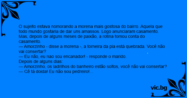 O sujeito estava nomorando a morena mais gostosa do bairro. Aquela que todo mundo gostaria de dar uns amassos. Logo anunciaram casamento.