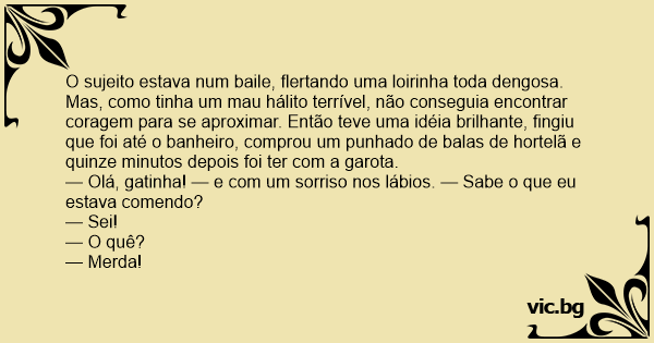 O sujeito estava num baile, flertando uma loirinha toda dengosa. Mas, como tinha um mau hálito terrível, não conseguia encontrar coragem para se aproximar. Então teve uma idéia brilhante, fingiu que foi até o banheiro, comprou um punhado de balas de hortelã e quinze minutos depois foi ter com a garota.