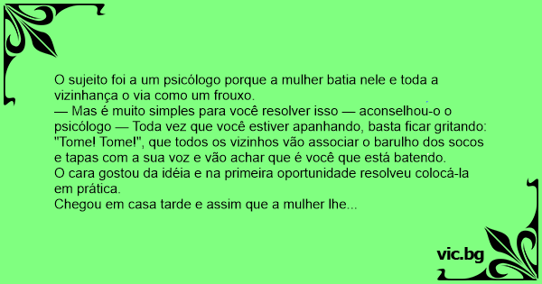 — Mas é muito simples para você resolver isso — aconselhou-o o psicólogo — Toda vez que você estiver apanhando, basta ficar gritando: