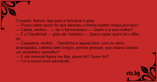 — Calma, senhor... — diz o farmacêutico — Quem é a sua mulher?