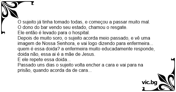 Já em liberdade ele volta a encher a cara, e bem em frente ao bar que ele estava tomando, vai passando uma prossissão, o sujeito vendo a imagem de Jesus que vai à frente, vai logo perguntando... quem é esse doido? e o pessoal que estava no bar responde, que doido rapaz, não tá vendo que esse ai é Jesus...
