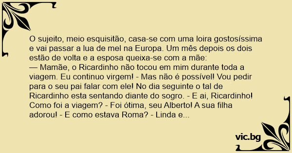 — Mamãe, o Ricardinho não tocou em mim durante toda a viagem. Eu continuo virgem! - Mas não é possível! Vou pedir para o seu pai falar com ele! No dia seguinte o tal de Ricardinho esta sentando diante do sogro. - E ai, Ricardinho! Como foi a viagem? - Foi ótima, seu Alberto! A sua filha adorou! - E como estava Roma? - Linda e eterna, como sempre! A sua filha adorou! - E Paris? - Muito romântica, como sempre! Os cafés, os bistros... a sua filha adorou! - E a Espanha? - Fomos ver uma tourada! A sua filha adorou! - Escuta, o Ricardinho! Vamos direto ao assunto, o que a minha filha adora mesmo é uma рiса deste tamanho! - Cruzes, seu Alberto! E quem é que não gosta?