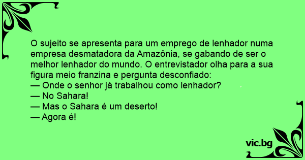 Πόντιος Ξυλοκόπος Une importante exploitation forestière du Canada passe un jour une petite annonce dans le but de recruter un bûcheron. В една северна страна се провеждало световно първенство по сечене на дървета. Kommt ein kleiner, dünner Mann zu den kanadischen Holzfällern und will sich um eine Arbeitsstelle bewerben. Der Betriebsleiter fragt ihn: Seit wann gibt es in der Sahara keine Bäume mehr? Un hombre de bilbao le dijo a otro tambien de bilbao : - Baco, gdzieście się nauczyli tak drzewo rąbać? - Na Saharze. - E, baco, kłamiecie! Przecież Sahara to pustynia. - No, teraz to już pustynia. C'est un gars énorme qui frappe à la porte du chef du personnel d'une entreprise de bûcherons au Canada, car il cherche du travail - Vous avez l'air costaud. Vous avez des références ? - Ouais!... Quand il était jeune, Chuck Norris était bucheron dans la forêt du Sahara. - Vous faisiez quoi avant ? - J'étais bûcheron. - Où ça ? - Dans le Sahara. - C'est un désert le Sahara ! - Maintenant oui. - EMBAUCHÉ ! abriu-se vaga para lenhador vários currículos foram enviados, um homem bem franzino resolveu se apresentar: - Você ja trabalhou onde? pergunta o entrevistador - Ja trabalhei no Saara!!! -... Szef drwali miał za zadanie ściąć drzewo. Próbuje, próbuje i nic. Woła podwładnych ale i oni nie mogą dać rady. Nagle zjawia się jegomość z siekierką w ręku i oferuje się ściąć drzewo. Szef się... - Buenas, estoy buscando trabajo como cortador de árboles. - Alguna experiencia? - Si claro, llevo los últimos 30 años cortando árboles en el Sahara. - Pero si ahí no hay árboles! - Para que... Όταν ο Τσακ Νόρις ήταν μικρός, ήταν ξυλοκόπος στο δάσος της Σαχάρας.