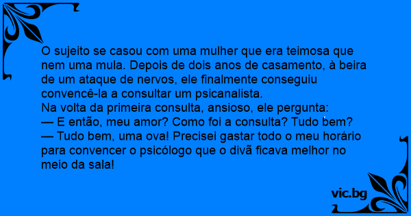 O sujeito se casou com uma mulher que era teimosa que nem uma mula. Depois de dois anos de casamento, à beira de um ataque de nervos, ele finalmente conseguiu convencê-la a consultar um psicanalista.