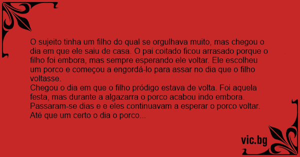 O sujeito tinha um filho do qual se orgulhava muito, mas chegou o dia em que ele saiu de casa. O pai coitado ficou arrasado porque o filho foi embora, mas sempre esperando ele voltar. Ele escolheu um роrсо e começou a engordá-lo para assar no dia que o filho voltasse.