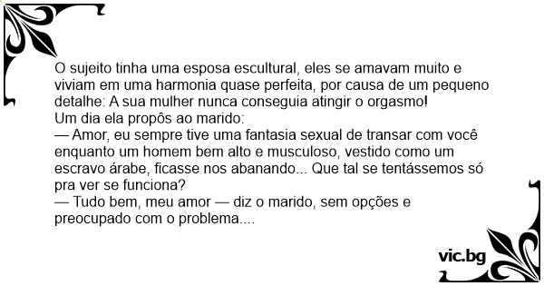 O sujeito tinha uma esposa escultural, eles se amavam muito e viviam em uma harmonia quase perfeita, por causa de um pequeno detalhe: A sua mulher nunca conseguia atingir o orgasmo!
