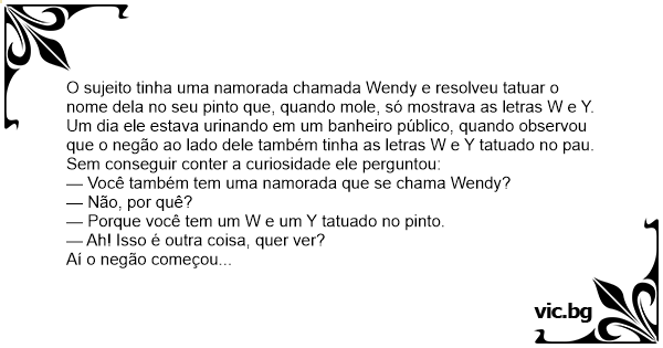 O sujeito tinha uma namorada chamada Wendy e resolveu tatuar o nome dela no seu pinto que, quando mole, só mostrava as letras W e Y.