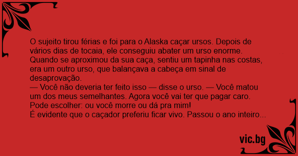O sujeito tirou férias e foi para o Alaska caçar ursos. Depois de vários dias de tocaia, ele conseguiu abater um urso enorme. Quando se aproximou da sua caça, sentiu um tapinha nas costas, era um outro urso, que balançava a cabeça em sinal de desaprovação.
