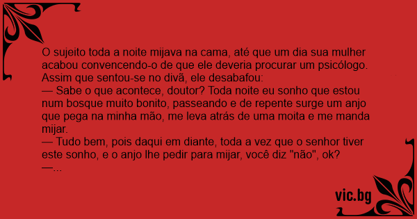 — Sabe o que acontece, doutor? Toda noite eu sonho que estou num bosque muito bonito, passeando e de repente surge um anjo que pega na minha mão, me leva atrás de uma moita e me manda mijar.
