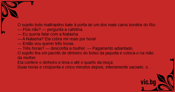 — Três horas? — desconfia a mulher. — Pagamento adiantado.