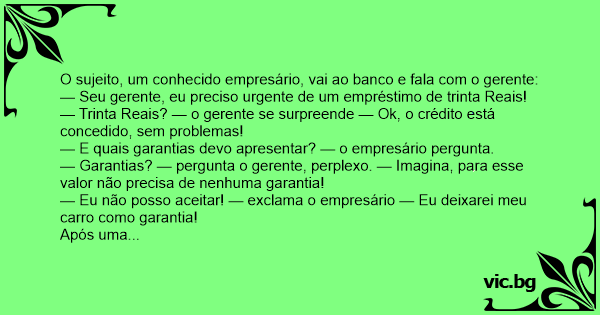 — Trinta Reais? — o gerente se surpreende — Ok, o crédito está concedido, sem problemas!