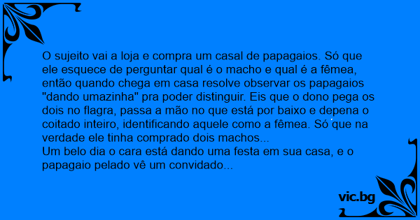 O sujeito vai a loja e compra um casal de papagaios. Só que ele esquece de perguntar qual é o macho e qual é a fêmea, então quando chega em casa resolve observar os papagaios "dando umazinha" pra poder distinguir. Eis que o dono pega os dois no flagra, passa a mão no que está por baixo e depena o coitado inteiro, identificando aquele como a fêmea. Só que na verdade ele tinha comprado dois machos...