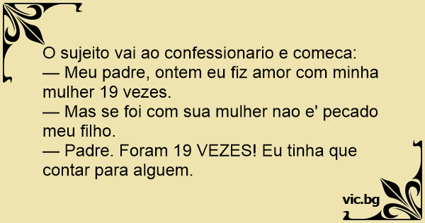 — Meu padre, ontem eu fiz amor com minha mulher 19 vezes.