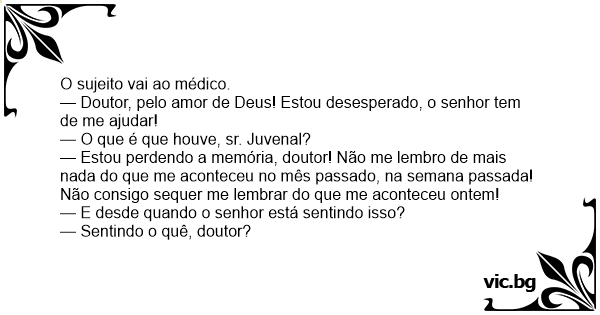 — Estou perdendo a memória, doutor! Não me lembro de mais nada do que me aconteceu no mês passado, na semana passada! Não consigo sequer me lembrar do que me aconteceu ontem!