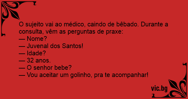 O sujeito vai ao médico, caindo de bêbado. Durante a consulta, vêm as perguntas de praxe: