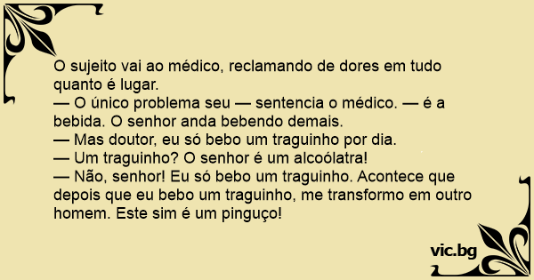 — O único problema seu — sentencia o médico. — é a bebida. O senhor anda bebendo demais.