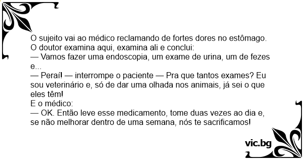 — Peraí! — interrompe o paciente — Pra que tantos exames? Eu sou veterinário e, só de dar uma olhada nos animais, já sei o que eles têm!