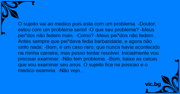 O sujeito vai ao medico pois esta com um problema. -Doutor, estou com um problema serio! -O que seu problema? -Meus pei*dos não fedem mais. -Como? -Meus pei*dos não fedem. Antes sempre que pei*dava fedia barbaridade, e agora não sinto nada. -Bom, é um caso raro, que nunca havia acontecido na minha carreira, mas posso tentar resolver. Inicialmente vou precisar examinar. -Não tem problema. -Bom, baixe as calcas que vou examinar seu аnus. O sujeito fiса na posicao e o medico examina. -Não vejo nada diferente. Mas de repente, se o senhor soltar um pei*do posso pode ajudar. -Bom, acho que tenho um a caminho. Bom, la vai BRRRRRRR. -Senhor, vamos ter que operar o mais rapido possivel. -Mas o que e`? E` serio? Vou ter que operar o c*u? -Não. Tem que operar o nariz!!