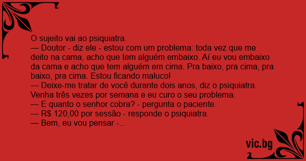— Doutor - diz ele - estou com um problema: toda vez que me deito na cama, acho que tem alguém embaixo. Aí eu vou embaixo da cama e acho que tem alguém em cima. Pra baixo, pra cima, pra baixo, pra cima. Estou ficando maluco!