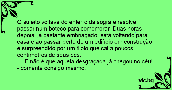O indivíduo voltando do enterro de sua sogra, passou em frente de um edifício em construção, nisso cai um tijolo em sua cabeça. Exclama o genro : — Já sei porra, chegaste no céu, não precisava me...