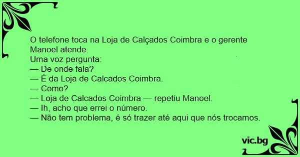 TRIIIM! Toca o telefone na sapataria do português, que atende: — Alô! Alôô! Casa de Calçados! — Como? – perguntam do outro lado da linha. — Casa de Calçados Coimbra! – repete o português. —...