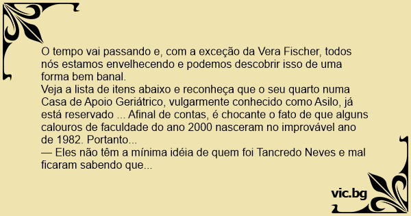 Veja a lista de itens abaixo e reconheça que o seu quarto numa Casa de Apoio Geriátrico, vulgarmente conhecido como Asilo, já está reservado ... Afinal de contas, é chocante o fato de que alguns calouros de faculdade do ano 2000 nasceram no improvável ano de 1982. Portanto...