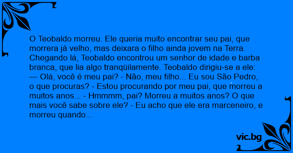 O Teobaldo morreu. Ele queria muito encontrar seu pai, que morrera já velho, mas deixara o filho ainda jovem na Terra. Chegando lá, Teobaldo encontrou um senhor de idade e barba branca, que lia algo tranqüilamente. Teobaldo dirigiu-se a ele: