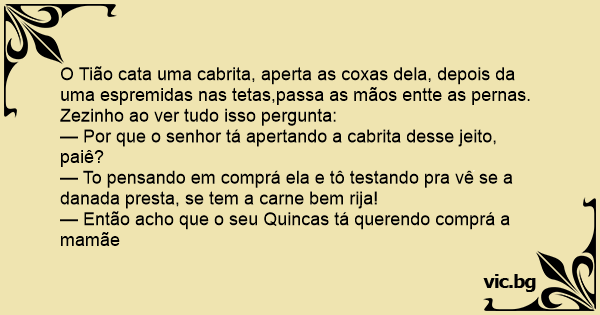 O Tião cata uma cabrita, aperta as coxas dela, depois da uma espremidas nas tetas,passa as mãos entte as pernas. Zezinho ao ver tudo isso pergunta: