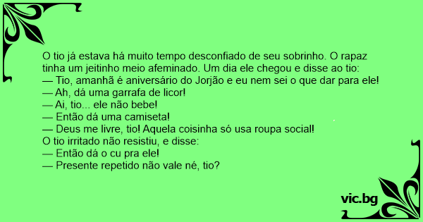 O tio já estava há muito tempo desconfiado de seu sobrinho. O rapaz tinha um jeitinho meio afeminado. Um dia ele chegou e disse ao tio: