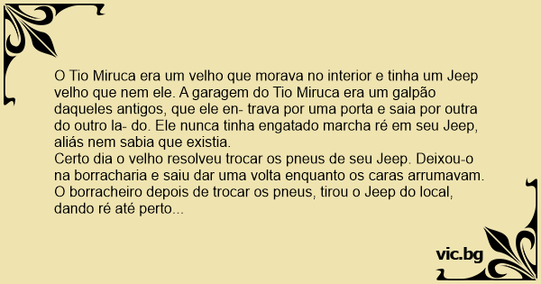 O Tio Miruca era um velho que morava no interior e tinha um Jeep velho que nem ele. A garagem do Tio Miruca era um galpão daqueles antigos, que ele en- trava por uma porta e saia por outra do outro la- do. Ele nunca tinha engatado marcha ré em seu Jeep, aliás nem sabia que existia.