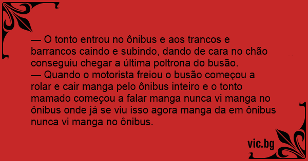 — O тоnто entrou no ônibus e aos trancos e barrancos caindo e subindo, dando de cara no chão conseguiu chegar a última poltrona do busão.