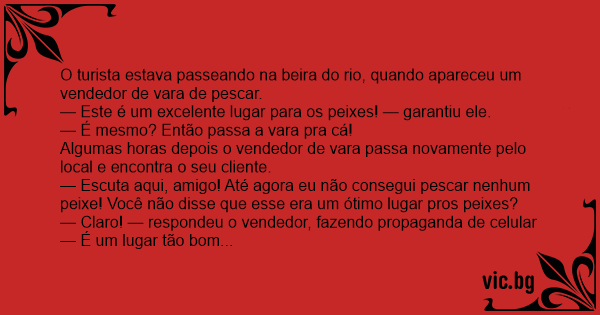— Claro! — respondeu o vendedor, fazendo propaganda de celular — É um lugar tão bom pros peixes que até hoje eu não consegui convencer nenhum a ir embora comigo!