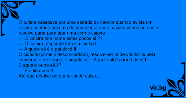 O turista passeava por uma estrada do interior quando avista um caipira sentado proximo de uma cerca onde haviam varios porcos, e resolve parar para tirar uma com o caipira :