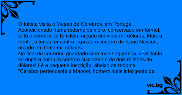 O turista visita o Museu de Cérebros, em Portugal. Acondicionado numa redoma de vidro, conservado em formol, tá lá o cérebro de Einstein, orçado em vinte mil dólares. Mais à frente, o turista encontra exposto o cérebro de Isaac Newton, orçado em trinta mil dólares.