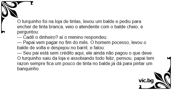 O turquinho foi na loja de tintas, levou um balde e pediu para encher de tinta branca, veio o atendente com o balde cheio, e perguntou: