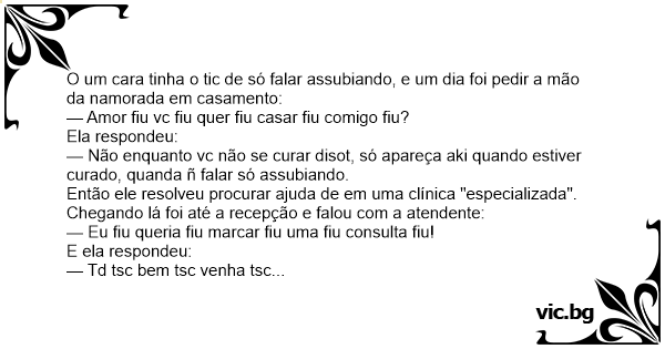 — Dr. fiu eu fiu tenho fiu esse fiu tic fiu de fiu falar fiu toda fiu vez fiu assobiando fiu! não fiu quero fiu mais fiu ! não fiu aguanto fiu!