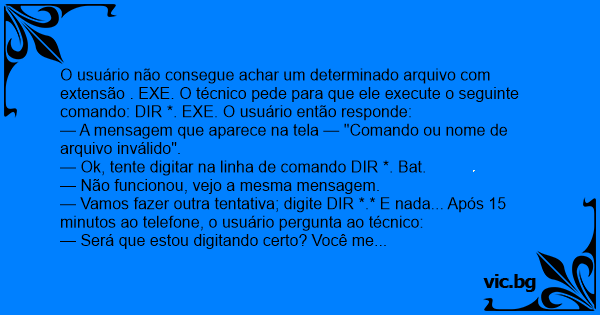 O usuário não consegue achar um determinado arquivo com extensão . EXE. O técnico pede para que ele execute o seguinte comando: DIR *. EXE. O usuário então responde: