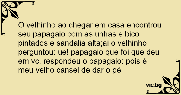O velhinho ao chegar em casa encontrou seu papagaio com as unhas e bico pintados e sandalia alta;ai o velhinho perguntou: ue! papagaio que foi que deu em vc, respondeu o papagaio: pois é meu velho cansei de dar o pé