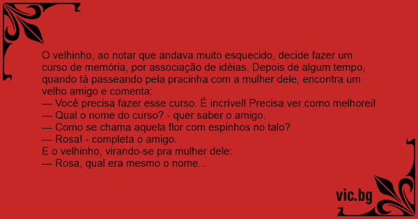 O velhinho, ao notar que andava muito esquecido, decide fazer um curso de memória, por associação de idéias. Depois de algum tempo, quando tá passeando pela pracinha com a mulher dele, encontra um velho amigo e comenta: