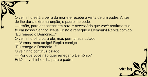 — Irmão, para descansar em paz, é necessário que você reafirme sua fé em nosso Senhor Jesus Cristo e renegue o Demônio! Repita comigo: