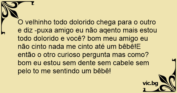 O velhinho todo dolorido chega para o outro e diz -puxa amigo eu não aqento mais estou todo dolorido e você? bom meu amigo eu não cinto nada me cinto até um bêbê!E então o otro curioso pergunta mas como? bom eu estou sem dente sem cabele sem pelo to me sentindo um bêbê!